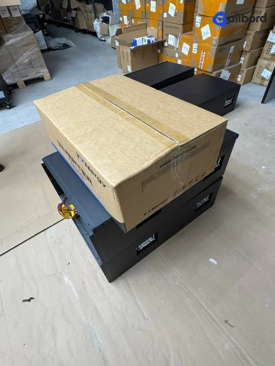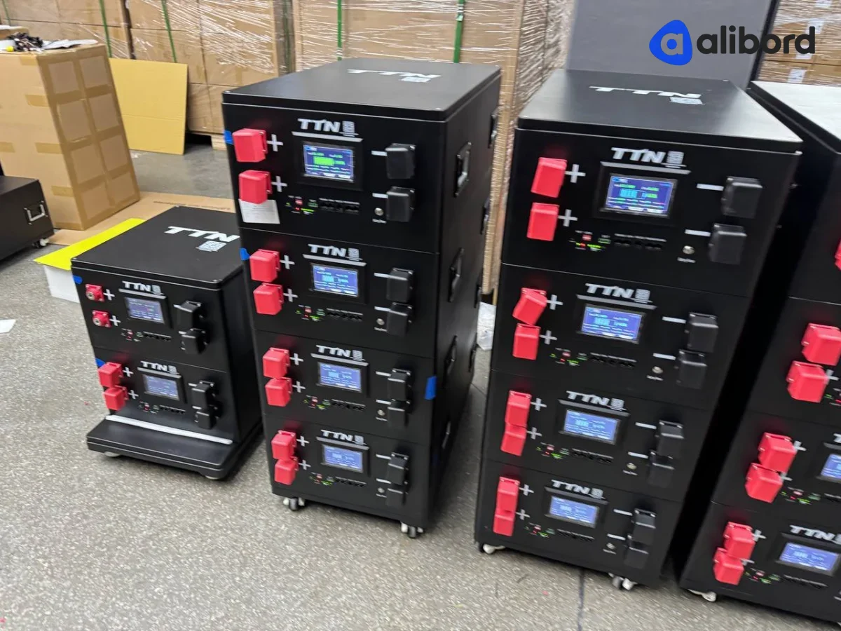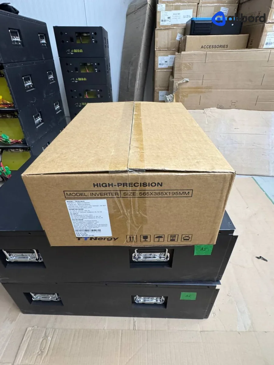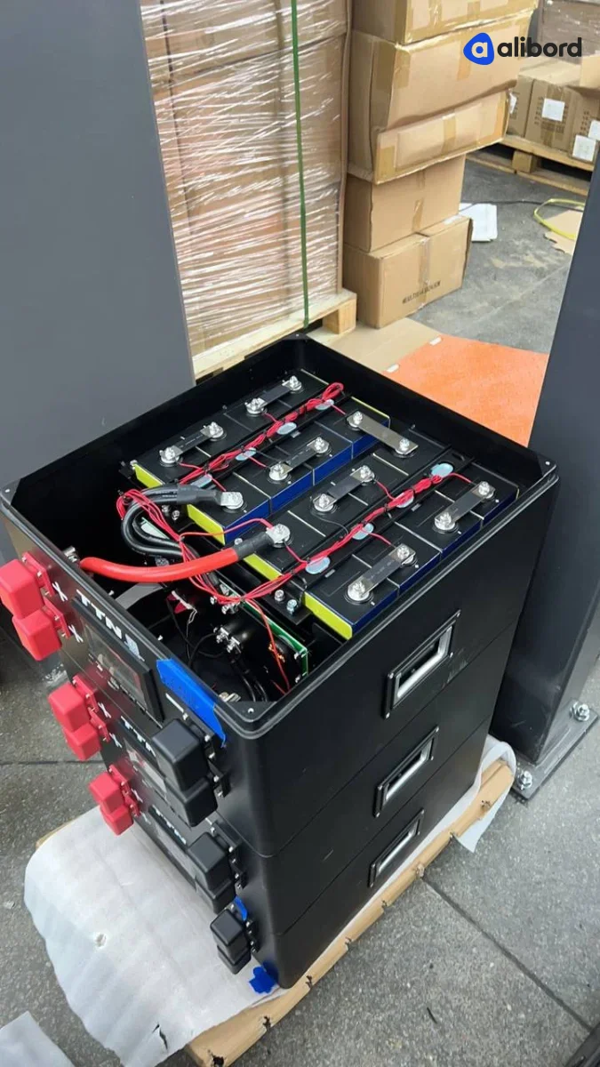 Акумуляторна батарея LiFePO4 промислового призначення напругою 24-48V з вбудованою системою управління. Комплект включає кілька модульних блоків з LCD дисплеями для моніторингу параметрів, червоними клемами підключення та внутрішньою комутаційною панеллю з предохоронителями. Устаткування поставляється в новому або близькому до нового стані, запаковано в захисні картонні коробки. Призначено для використання у системах безперебійного живлення, сонячних станціях та енергосховищах. Фізично товар без видимих пошкоджень корпусу, всі екрани і індикатори в робочому стані.